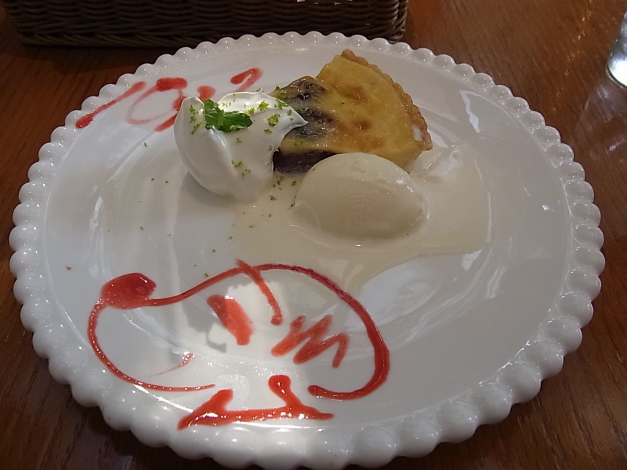 パークサイド・グリルでのお茶タイムにはダークチェリーのタルト。お姉さんが、ストロベリーソースでさくさく~っとスヌーピー描いてくれました。